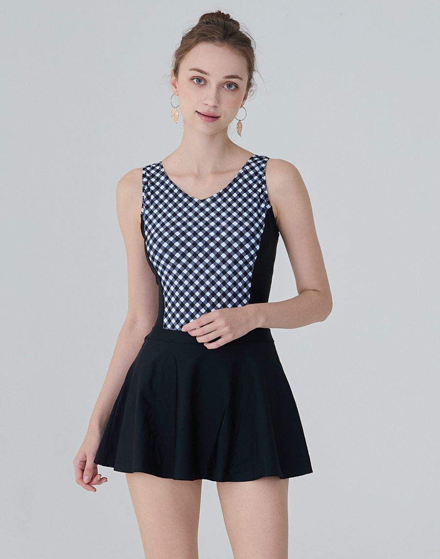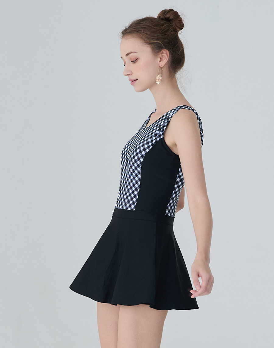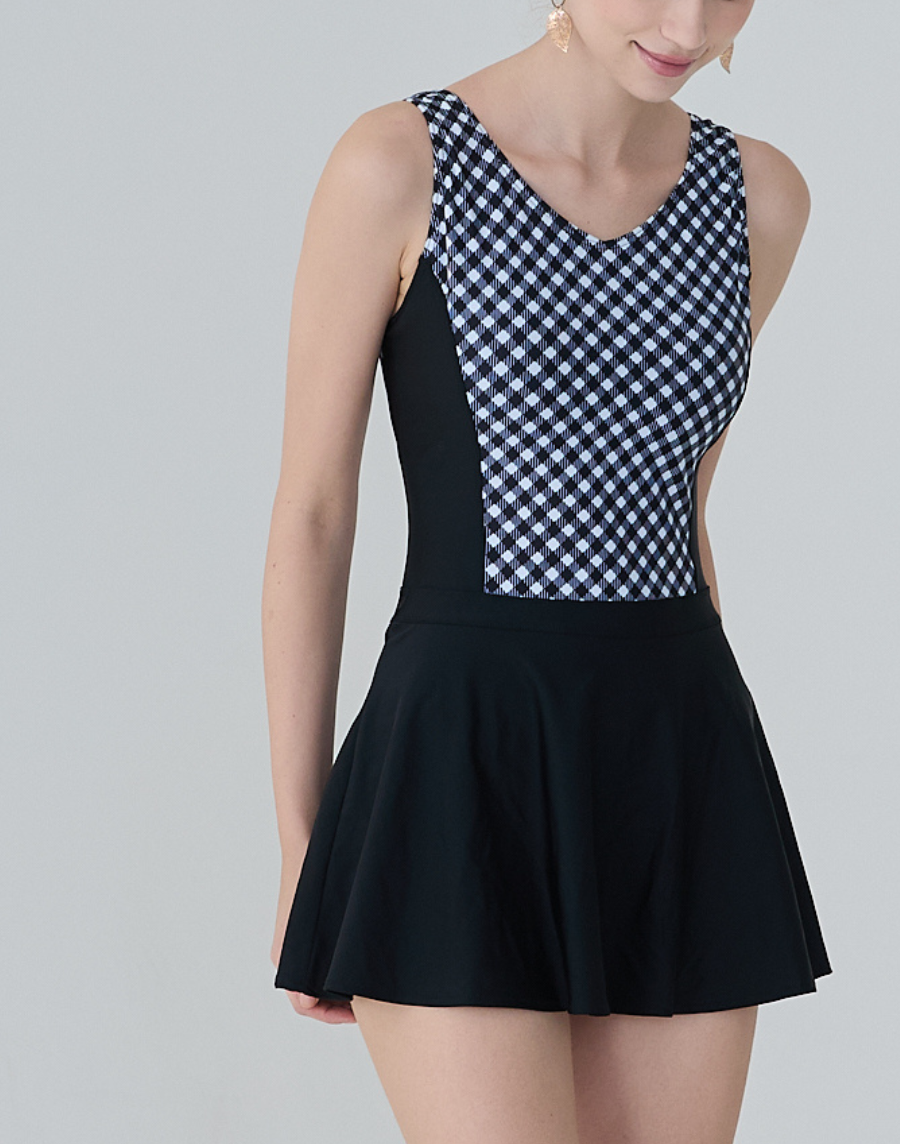Haolang 經典黑格紋顯瘦連身裙泳衣