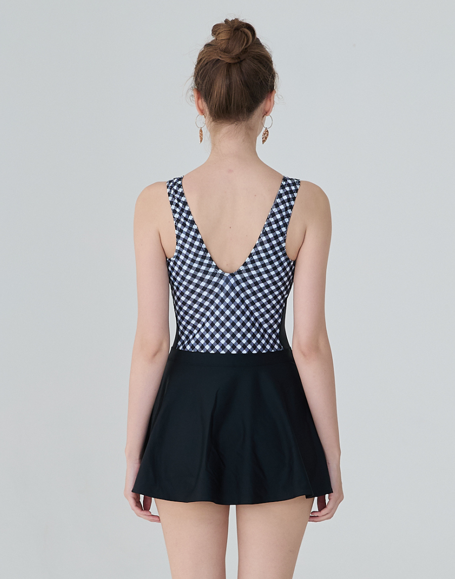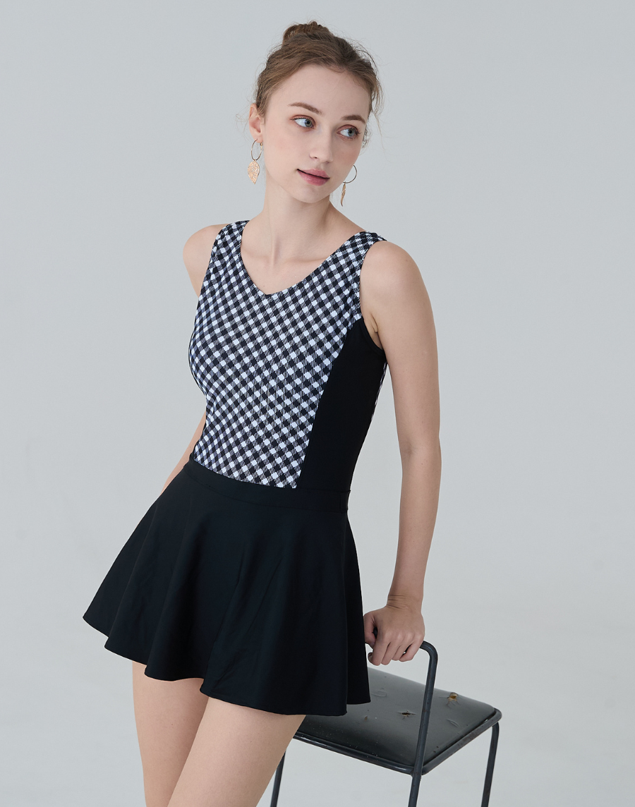 Haolang 黑白格紋連身裙泳衣